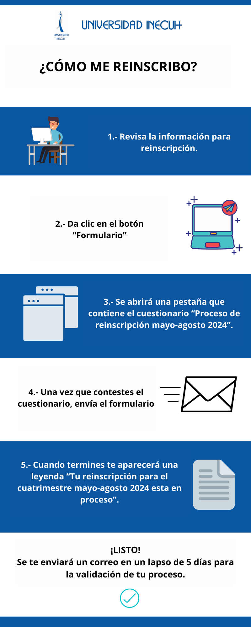 - El formulario para realizar tu reinscripción estará habilitado del 15 al 27 de abril de 2024.