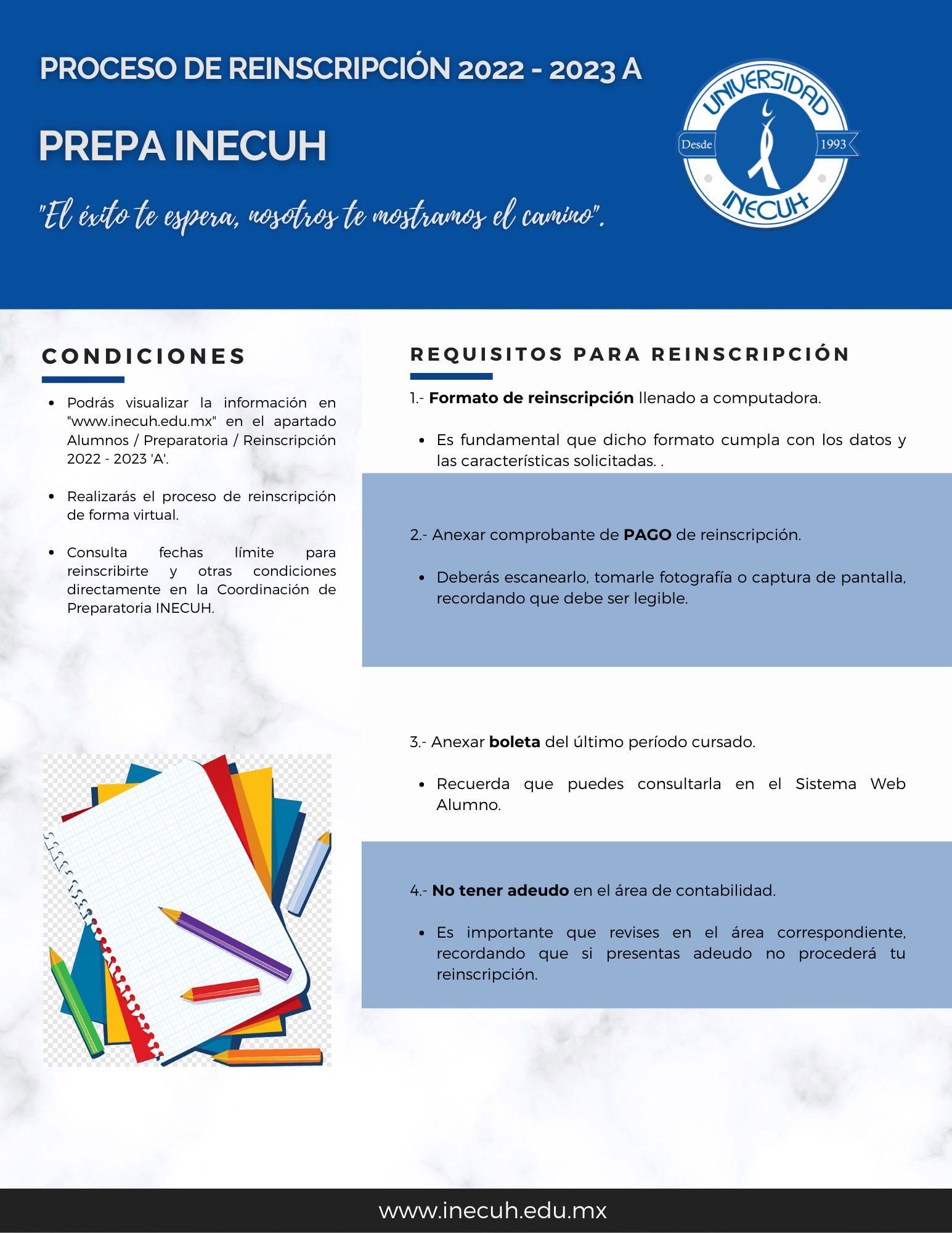 - El formulario para realizar tu reinscripción estará habilitado del 02 al 13 de enero 2023.